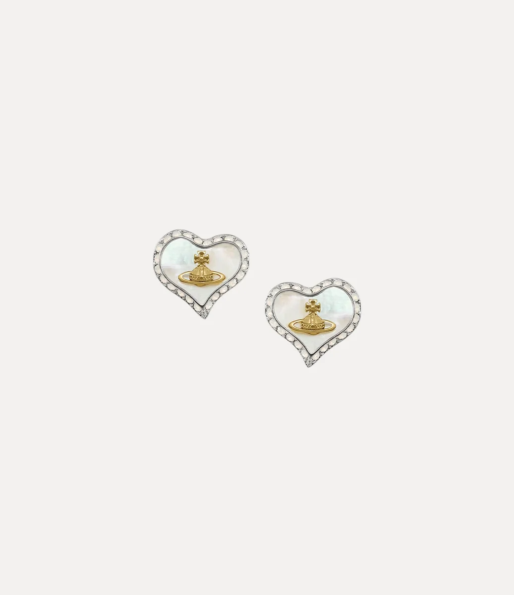 The asymmetric heart shape has become a signature style of the house, which Vivienne used to evoke affection for both humanity and the planet. Our Petra earrings adopt a heart silhouette, adorned with white-coloured crystals and a contrasting gold-toned orb motif – synonymous with the house’s ethos of launching the past into the future.