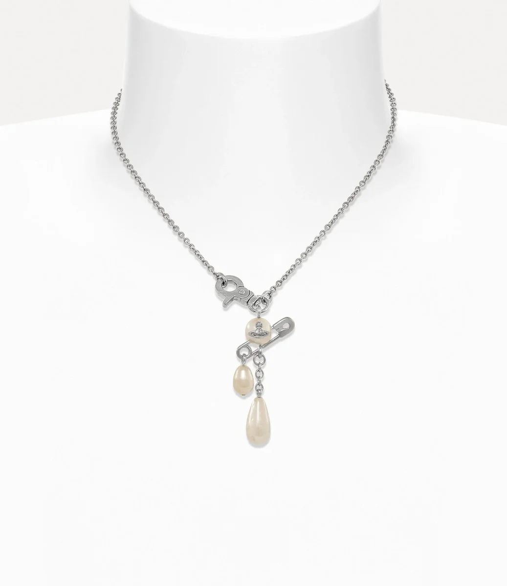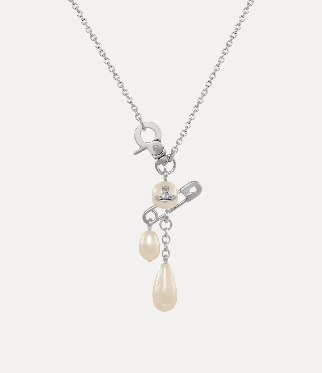 The Claude Small necklace features a rounded pearl with a central orb, accented by a signature safety pin detail – a nod to Vivienne’s punk-inspired, non-conformist style. A pearl drop and delicate chain details hang elegantly from the pendant, adding movement to the design, while the hardware-inspired clasp allows for an easy closure.