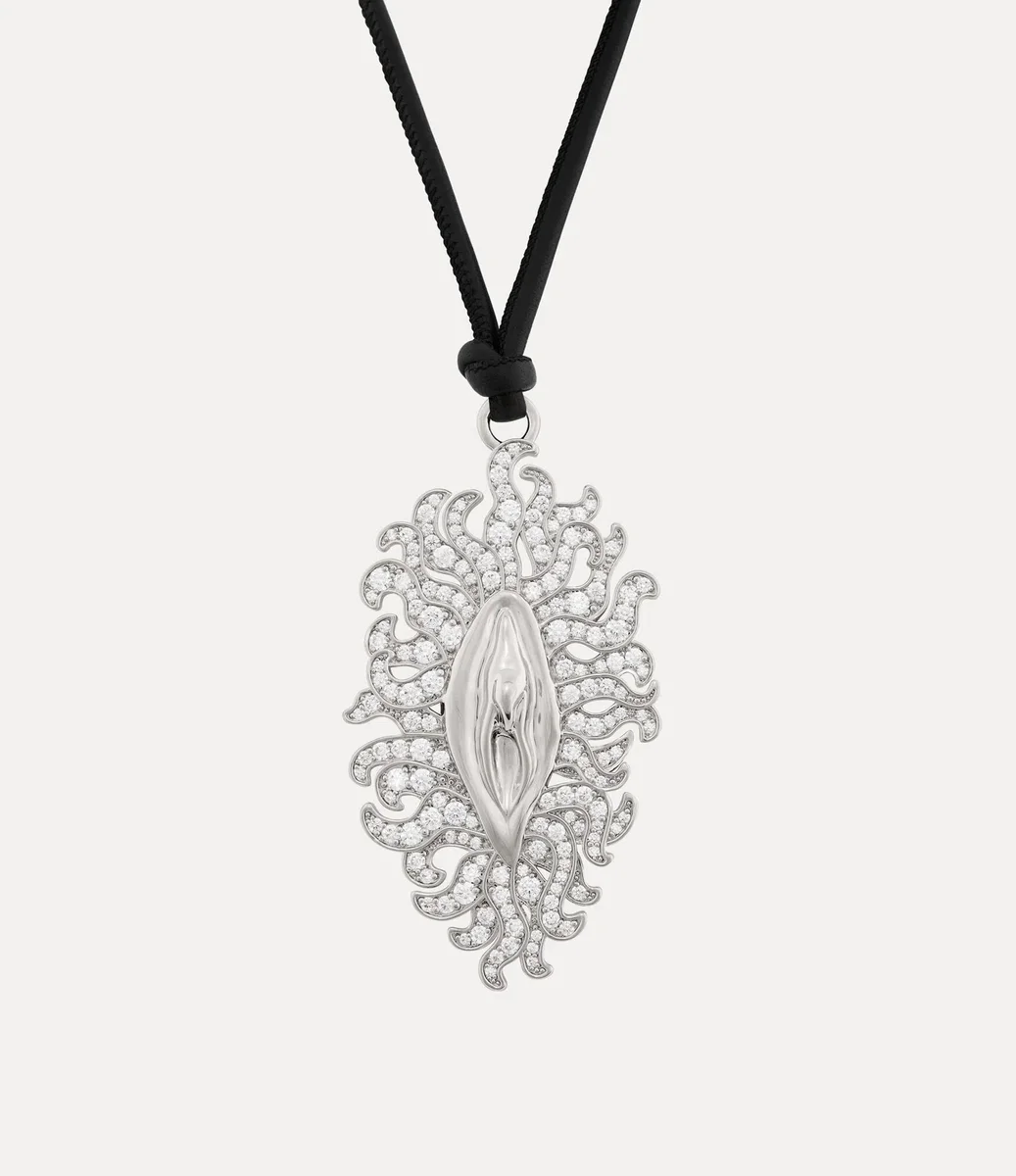 The Floriana Pendant necklace draws inspiration from the house’s iconic ‘Vagina’ motif, first introduced on the Andreas Kronthaler for Vivienne Westwood Autumn–Winter 2019/2020 runway. The bold motif, adorned with white crystals, hangs from an adjustable black Italian leather cord and echoes Vivienne’s admiration for ancient art, where it was often associated with themes of fertility or strength.