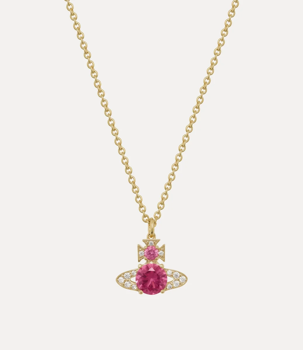 Our Ismene Pendant necklace returns this season in a polished gold-tone finish, adorned with pink and white crystals in an elegant pavé setting. Detailed with delicate cut-outs along Saturn’s rings, the design is completed with an oval tag, engraved with our lettering at the lobster-clasp fastening.