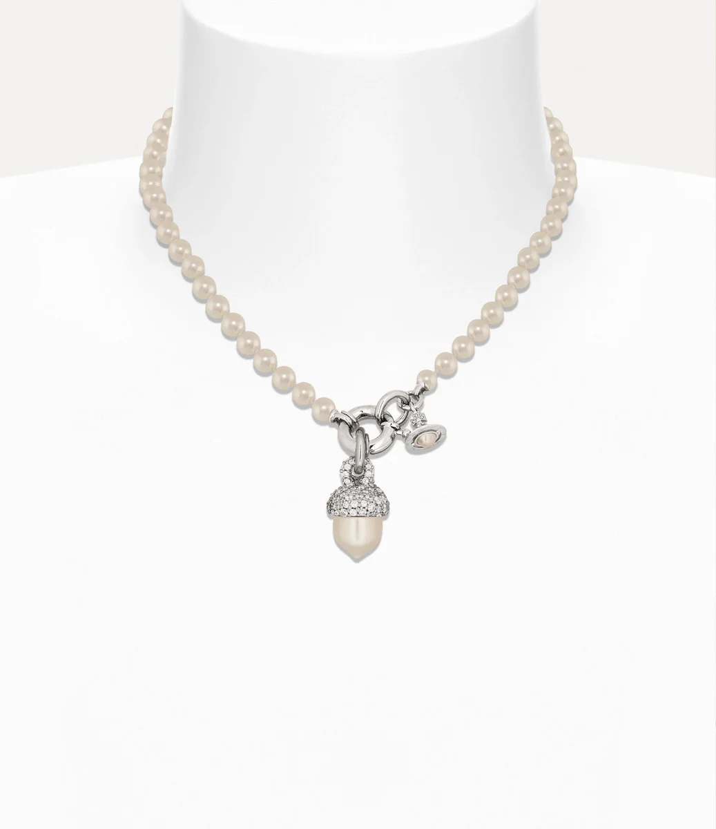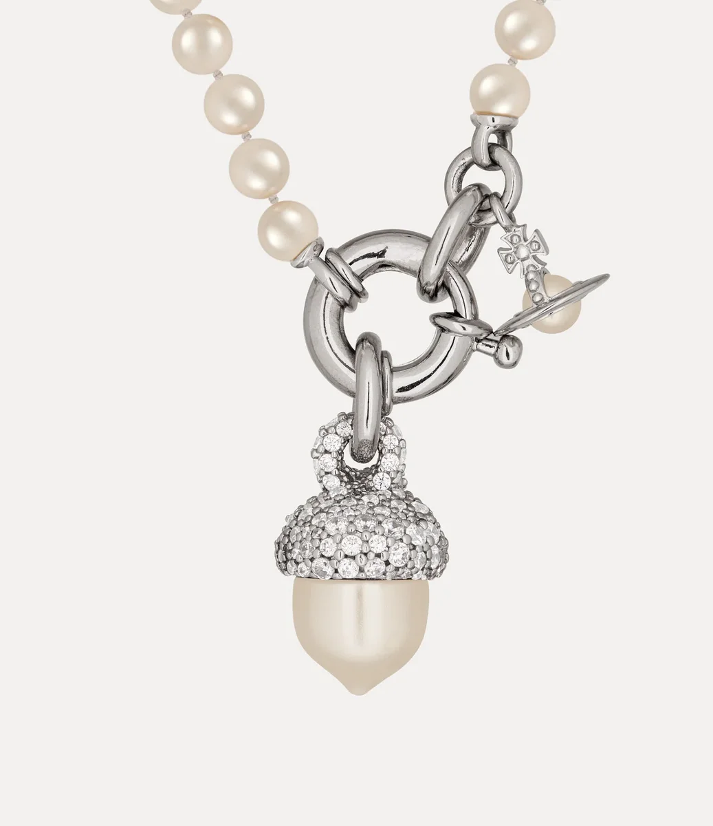 The Lucille Pearl necklace evokes a sense of grandeur and luxury, strung with a row of glistening Swarovski glass pearls. At its centre, a pavé-embellished acorn motif with a lustrous pearl finish is suspended alongside a pearl orb, encased in a polished silver-tone metal framework.