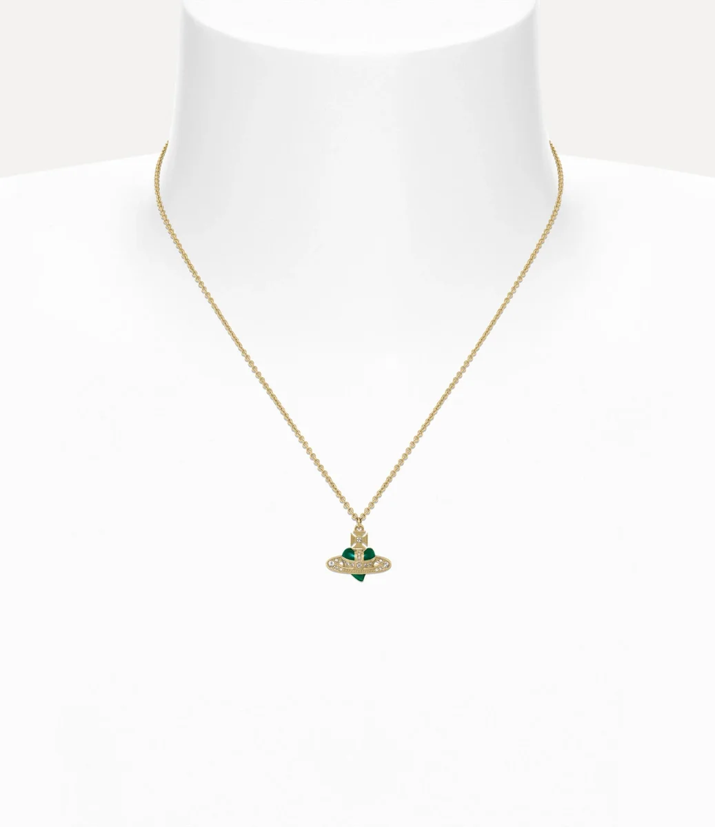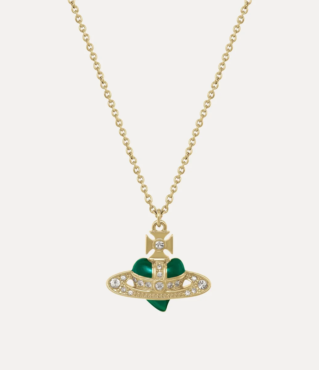 The heart shape has become a signature style of the house, synonymous with Vivienne’s affection for both humanity and the planet. Our New Diamante Heart Pendant necklace revives our iconic asymmetric heart silhouette, outlined with gold-coloured crystals and finished with hand-painted translucent enamel in the centre of the design.
