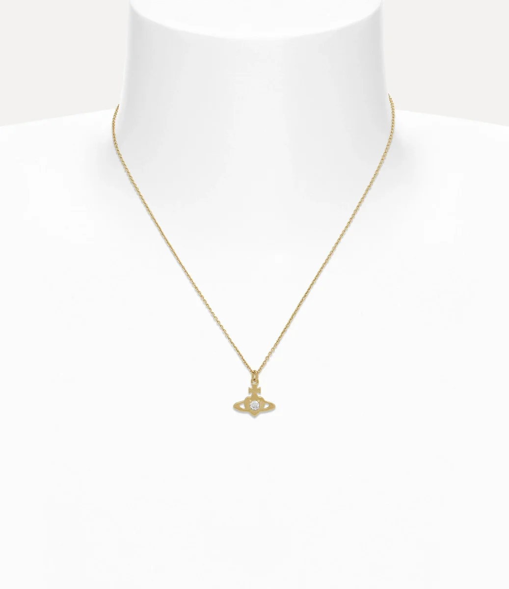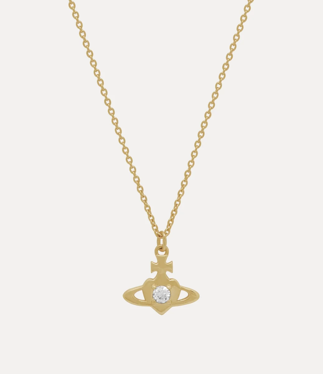 Our Noella Pendant necklace features a gold-tone finish, adorned with a heart orb motif, recalling Vivienne’s affection for humanity and the planet. Crafted from recycled silver, the piece is embedded with a white crystal in the centre of the design.