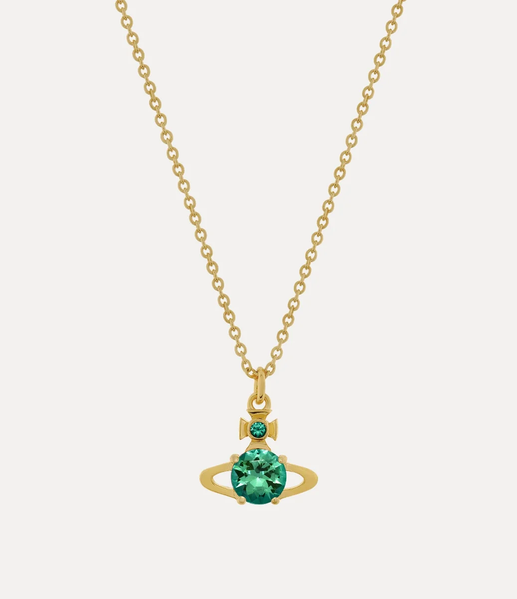 Vivienne Westwood Reina Pendant necklace in gold-toned plating features the classic two-dimensional orb shape encrusted with light turquoise crystals.