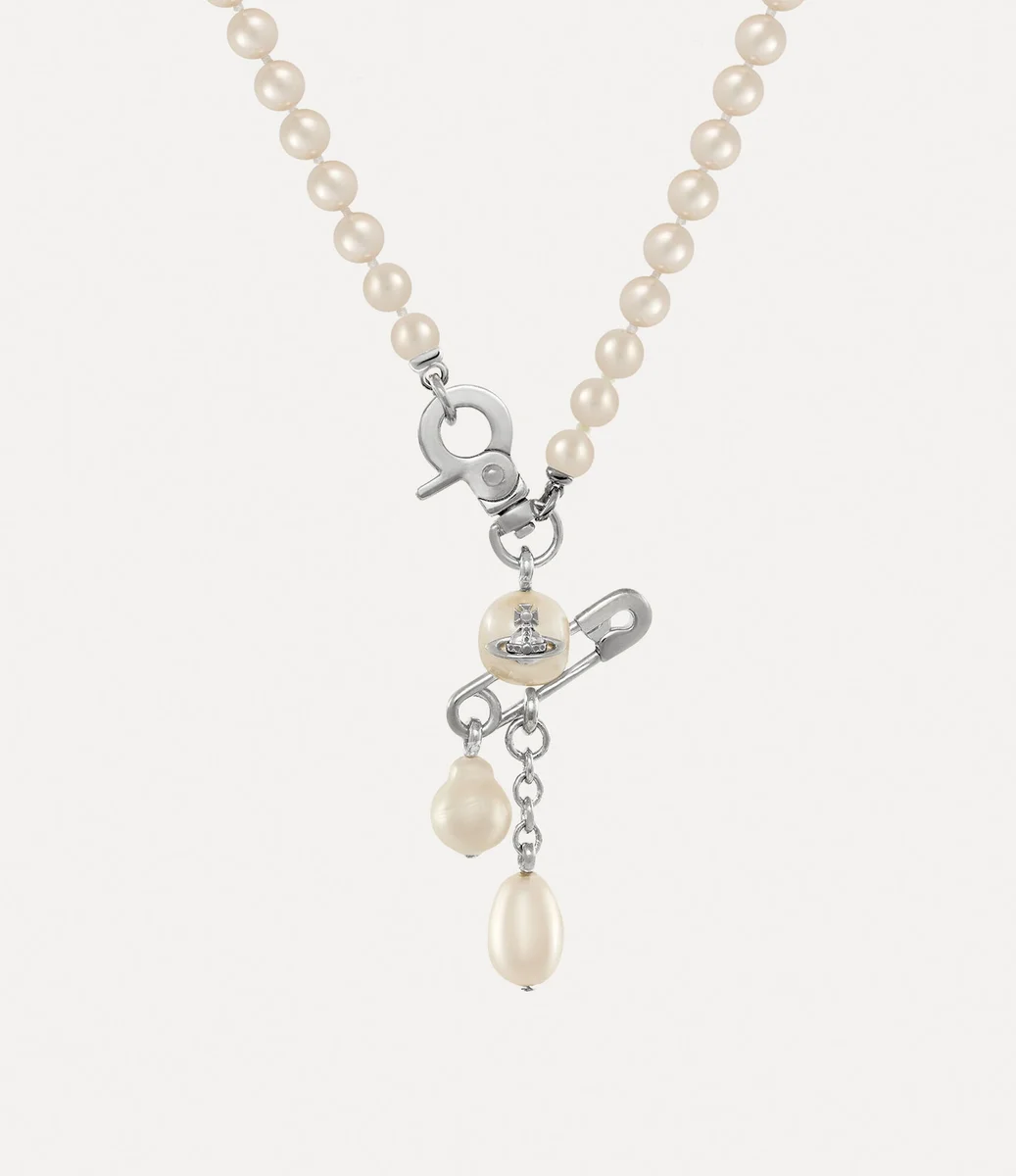 The archival Small Claude Pearl necklace has been updated this season with single row of glistening Swarovski glass pearls, offering a rounded pearl detail in the centre, complete with a classic safety pin pierced through the design – evoking Vivienne’s signature punk aesthetic.
