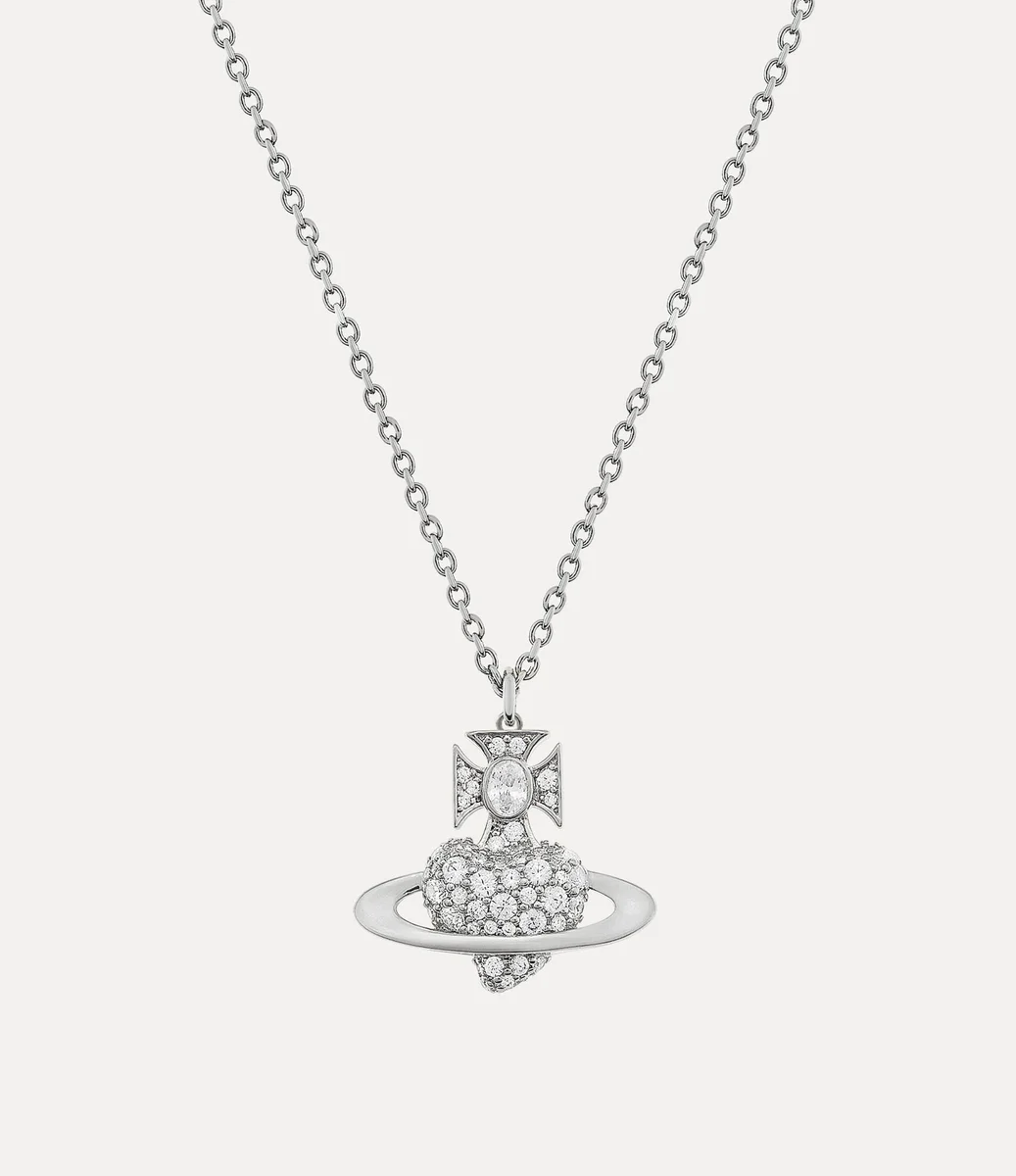 Our Valentine’s Agnatha Bas Relief Pendant necklace revives an archival asymmetric heart design, reflecting Vivienne’s love for humanity and the planet. The heart-shaped pendant, adorned with glistening white crystal details, is encircled by Saturn’s celestial rings in white enamel, symbolising the future, and is adorned with polished, silver-toned plating.