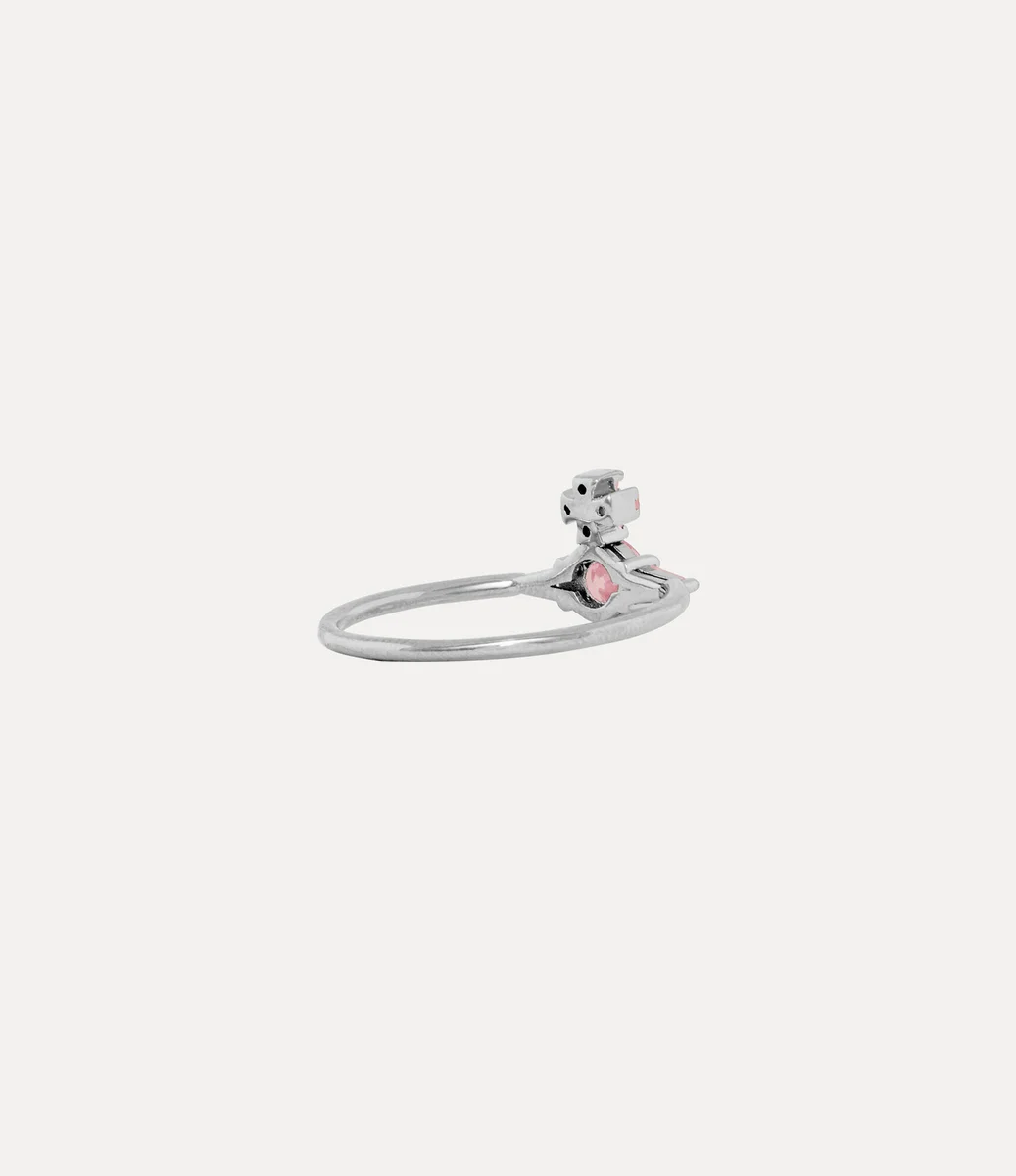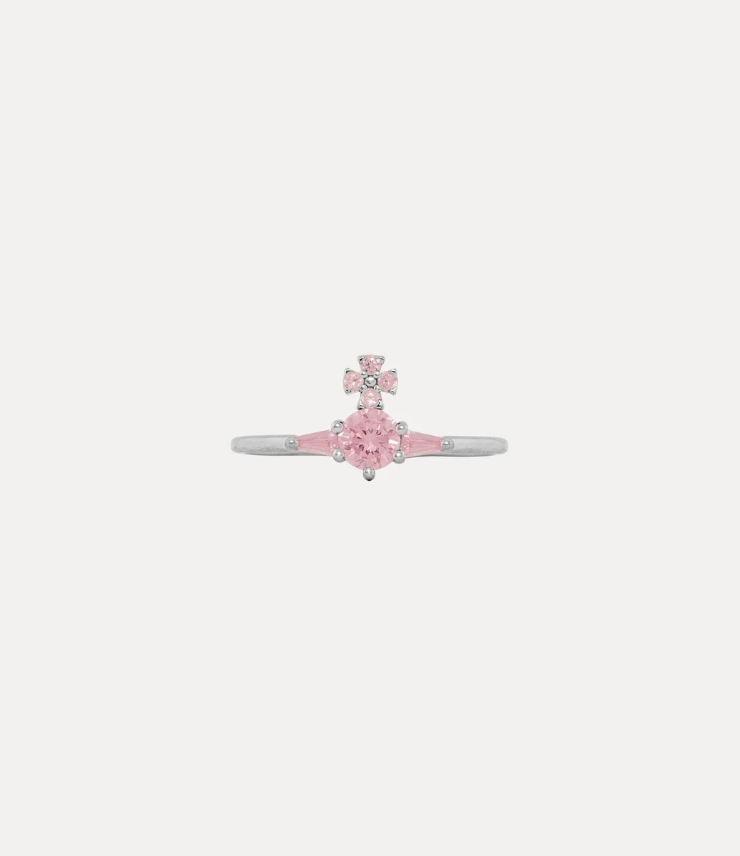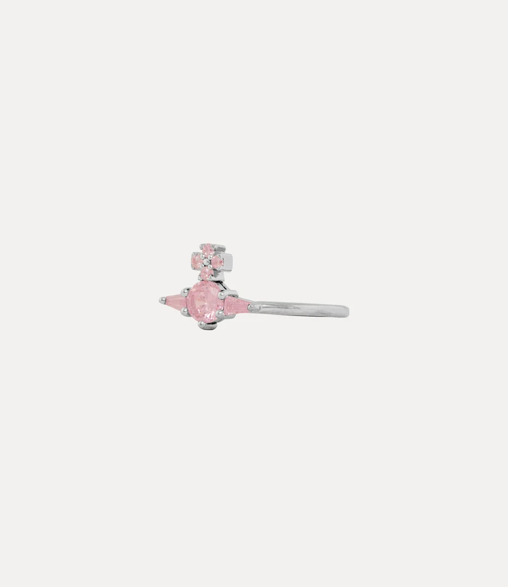 Our Ofelia ring is crafted from platinum-tone silver and centred with a delicate orb motif, inspired by the house’s signature emblem. The design is set with a round-cut pink crystal, framed by tapered baguette crystals and pavé detailing at the cross top, embodying Vivienne’s vision of launching tradition into the future.