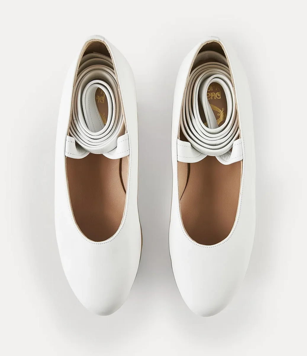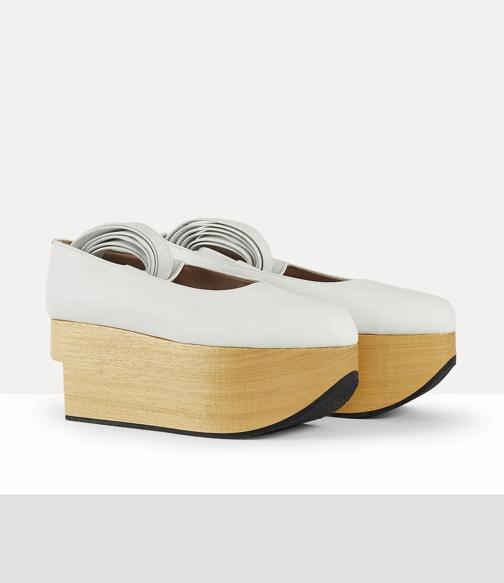 Our Rocking Horse Ballerina shoes were first revealed in the Vivienne Westwood Autumn-Winter ‘87/88 ‘Harris Tweed’ collection, designed to achieve poise and movement. The curved front and cut-out detail in the high wooden platform allows the wearer to rock forwards as they walk, while the delicate leather tie ribbons draw inspiration from ballet pointe shoes.